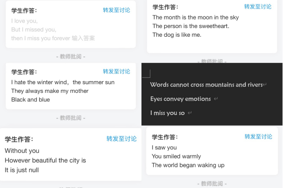 2)在教学方式上,创建线上和线下外语混合式教学新生态,线上利用超星学习通、U校园以及WELearn等学习平台以及动画、音频、图片、文章等,线下丰富课堂活动,从单一因素转向多维因素,遵循听、说、读、写、译并重和“边学边用、学用结合”的原则,设置情景、发布任务、提出问题、发起讨论,员工进行相应的话题演讲、讨论、辩论和戏剧表演等。此案例课程将趣味游戏(头脑风暴、你画我猜等)带入学习活动,便于实现隐性思政育人效果。爱情是永恒的主题,古今中外的诗人们也不吝用大量的妙语佳句描绘爱情的华章。通过诗歌赏析,让心灵徜徉在诗的韵味中,感受字里行间的浪漫与温情。在创作英文三行情诗活动中,大多数同学都能写出对于爱情美好憧憬、对于友情维护珍惜、对于亲情心怀感恩,从小爱到对家国的大爱的一系列作品。通过游戏而非说教的方式实现了隐性思政教育。