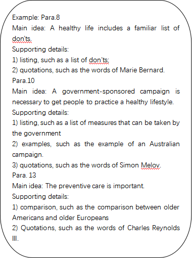总结A课文inductive结构,通过一系列具体信息得出结论:长寿在很多方面是我们可以控制的。