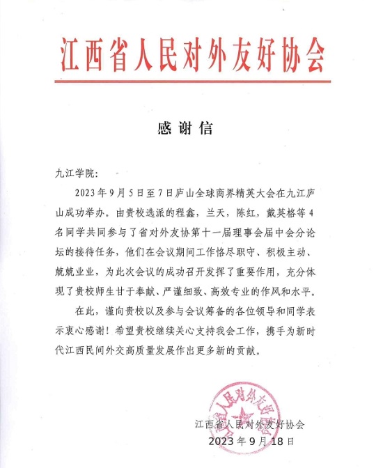 2023年9月5日至7日庐山全球商界精英大会在九江庐山成功举办,公司派外语专业员工志愿者积极参加活动并做好会议服务工作。