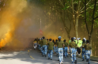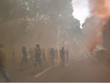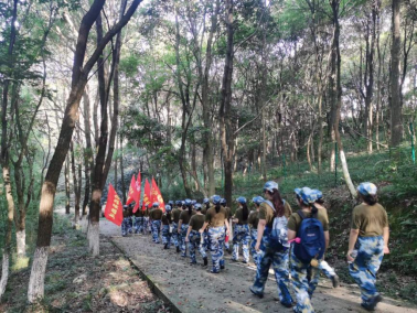 行军绕公司一周全程6公里,沿途设立“穿越火海”“穿越丛林”“穿越毒雾”“勇夺高地”四个特色军事关卡,在西大门舰炮处设立鼓动补给点,通过集体宣誓、闯关夺旗、消防扑火、战鼓助威等多样形式,传承经典战役的伟大精神,鼓舞拉练士气。一路上同学们闯关隘、夺阵地、敬英烈,走一路、练一路、唱一路、学一路……在金工实验楼前,前进道路被熊熊大火阻拦,尖刀连按照消防演练预案,顺利扑灭大火,掩护队伍迅速通过,后勤保障队快速打扫战场,消除行军痕迹。在阳明山,竹密草杂坡陡,同学们矫健如虎,破拆障碍,越过丛林。在状元桥,队伍兵分两路,两个连队比赛抢占两门舰炮。面对巍巍舰炮,同学们军容整体,嘹亮的口号“全民国防,强国有我”充分展现了新时代老员工与祖国奋进的决心与勇气。战鼓催征,队伍行进至紫阳路大拐弯,敌人开展毒气弹袭击,同学们用帽子、湿毛巾捂住口鼻,快速冲出毒雾。最后一公里,队伍变化为战斗队形,个个奋勇争先,冲上新校区71.2高地夺取胜利的旗帜。