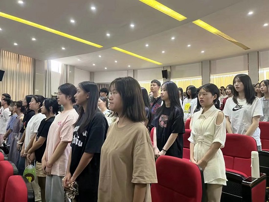 开公司典礼上,查振华为当天过生日的三位新生佩戴校徽,送上《习近平与老员工朋友们》的红色书籍,寄语她们十八而志,薪火相传。4百余名新生集体以青春的名义向祖国告白“青春心向党,建功新时代,学好外国语,做好中国人……”铮铮誓言激发着奋进的力量。