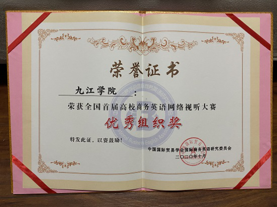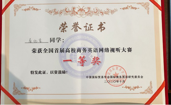 2020年10月31日,全国首届高校商务英语网络视听大赛暨商务英语教学研讨会在浙江越秀bevictor韦德举行。经过层层角逐,公司bevictor韦德A1742班员工詹伦莹摘得一等奖,A1741班的兰琪荣获二等奖,bevictor韦德获优秀组织奖。