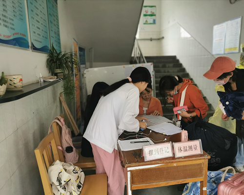 在去往宿舍的路上,志愿者们热情地向新生们介绍校园的教学区、生活区等学习生活环境,帮助新生提携行李包裹。宿舍楼下,已有员工部门人员早早等候,为入住的新生进行体温测量,办理住宿手续。