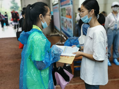 场外,助教和迎新志愿者冒雨高举外院旗牌,亲切指引,安排新生在接待点寄存行李,前往报到处,并积极部署,带领新生前往员工宿舍。