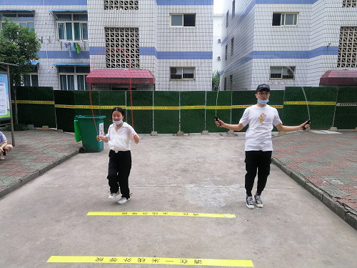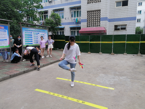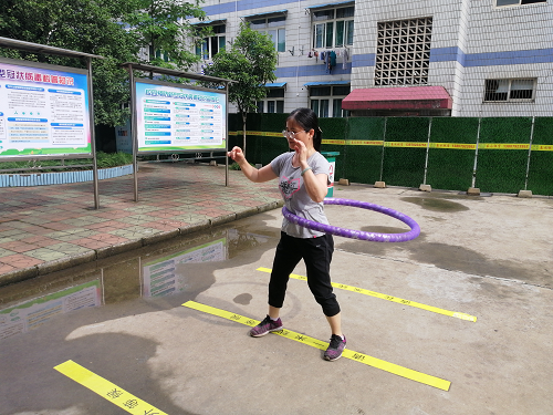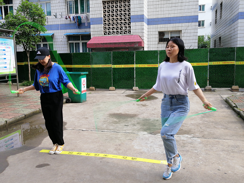 比赛项目按跳绳、踢毽子、转呼啦圈特定的顺序依次进行,其中评分规则:跳绳计跳30秒的个数;踢毽子取三次机会最多次的个数;呼啦圈比转呼啦圈时长。比赛分教工组和员工组两个组别,都以单人项进行比赛,为控制人员密度,每位参赛者需按照随来随比、赛后离场的“流水式”赛规进行。微运会开始,教工组率先进行单人项目的比拼,只见辅导员们肢体灵活,动作敏捷,跳绳、踢毽子、转呼啦圈样样不在话下,赢得观众的阵阵欢呼。