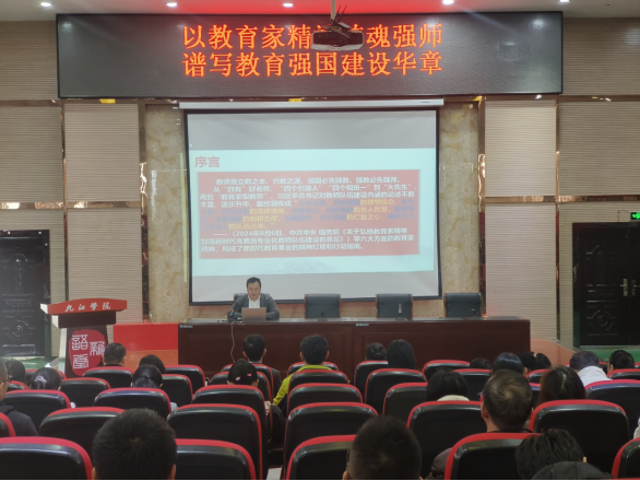 谢伏华以“以教育家精神铸魂强师,谱写教育强国建设华章”为主题,结合自己为师的经验体会,围绕教育家精神的理论逻辑、时代创新和弘扬路径三个方面展开阐述。谢伏华表示,教育家精神是中华传统师道思想的新时代凝集,统整焕新了我国传统师道思想“家国天下”的价值论、“仁爱奉献”的目的论与“因材施教”的方法论,彰显了我国传统文化基元融入中国现代化建设的文化自信,倡导全体教职工不断提高自身道德修养,以模范行为影响和带动员工,做员工智慧的“经师”、员工典范的“人师”、员工成长道路上的引路人。