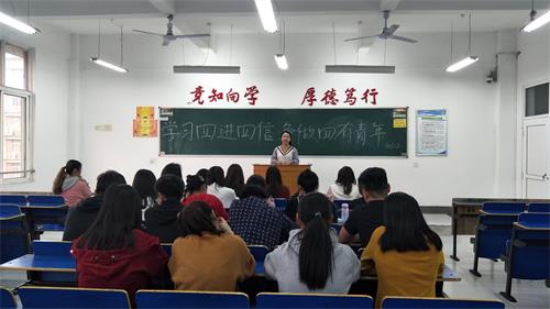 随后,徐亚丽同志向同学们提出是否了解“四进四信”这一词语,引发了同学们对此次活动主题的思考,在提问了两位同学之后,她为大家针对该词语作出了进一步的解释。她指出,我们要以“四进”为手段,“四信”为目标,通过“进支部、进社团、进网络、进团课”,引导帮助同学们进一步牢固树立对党的科学理论的信仰、坚定走中国特色社会主义道路实现“中国梦”的信念、增强对党和政府的信任、增进对以习近平同志为核心的党中央的信赖。